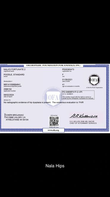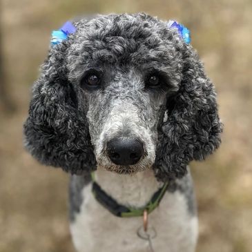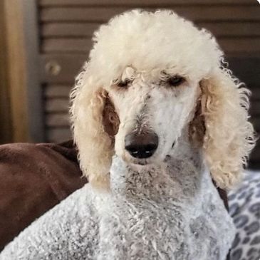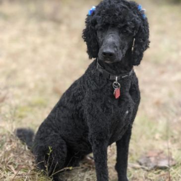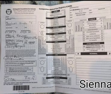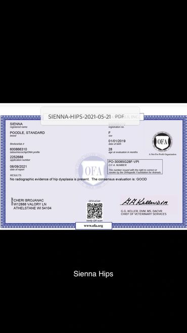 Sienna is a very high energy and happy dog. She gets along well with the other dogs but her dominant nature can get her in trouble at times with others in the pack. She loves to hold a ball in her mouth not actually chasing a ball just holding it. She's a very loyal dog and is by my side always. She's an excellent mother and often mothers other puppies from different litters. Sienna throws parti poodles in a variety of colors. Sienna is dna'd & ofa'd and eye certificated and is retired.
