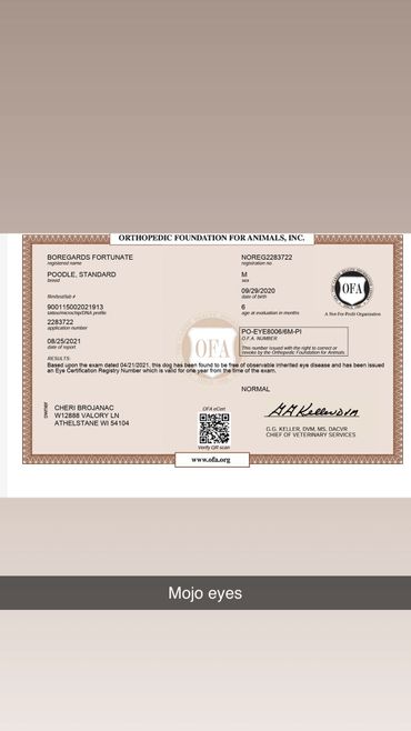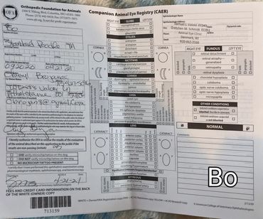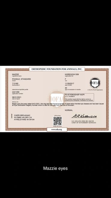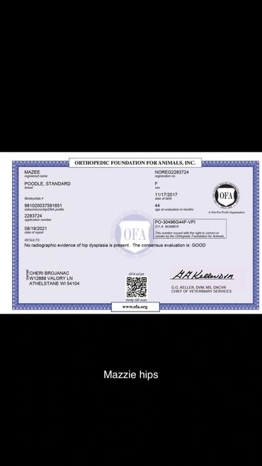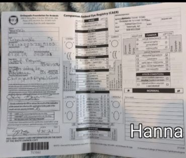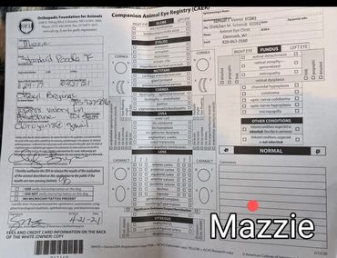 Mazzie has an amazing personality! Always wanting to please. She gets along with other dogs, cats, and kids. She is a great mom and her 1st litter was a litter of 15. With some xtra help all survived. She is of'd, dna'd and eye certificated.